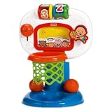 Baby shoots... and scores! Get in the game with two stages of rewarding play. Start with put-and-take fun as baby places balls into the basket for music and sounds -- with a BIG reward for every slam-dunk. As babies grow, adjust the four-position post so they can stand and make a basket. Push down on the hoop -- it's another slam-dunk, and the crowd cheers encouragement! Includes two soft basketballs and a wiggly-jiggly teammate! Requires three "AA" batteries, not included. Measures 11.5"L x 12.5"W x 21"H.