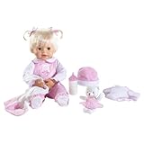 The adorable baby doll has rooted blond hair and her eyes open and close. She is dressed in a pink footed jumper with a matching soft hat. Other accessories include a baby blanket, her feeding bottle, a teddy bear, and a diaper. Four AA batteries are required, but not included.